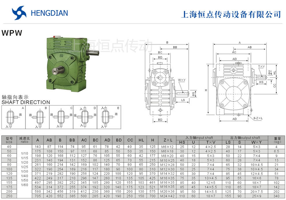 選型指南,WPW萬能型減速機軸輸入,軸輸出.WPW萬能型減速機軸指向表示方法.機座号40到250,速比10到60.WPW萬能型減速機的外形尺寸及安裝尺寸