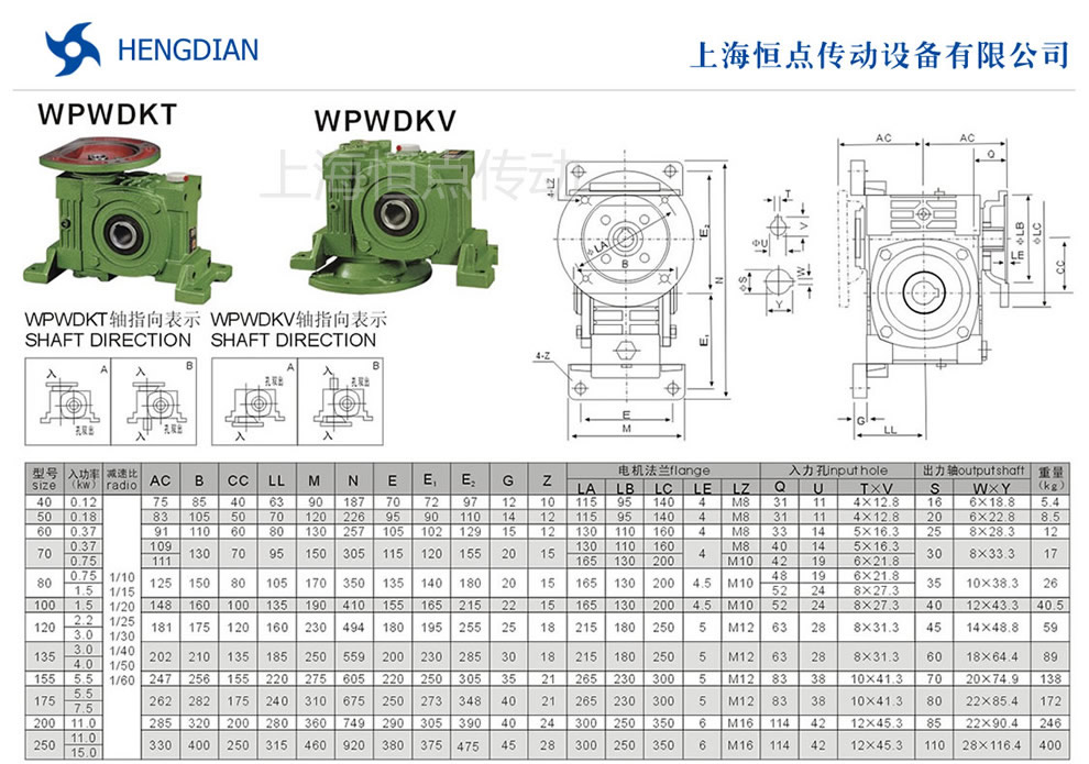 選型指南,WPWDKT與WPWDKV萬能型減速機軸輸入,軸輸出.機座号40到250,速比10到60.WPWDKT與WPWDKV減速機的外形安裝尺寸